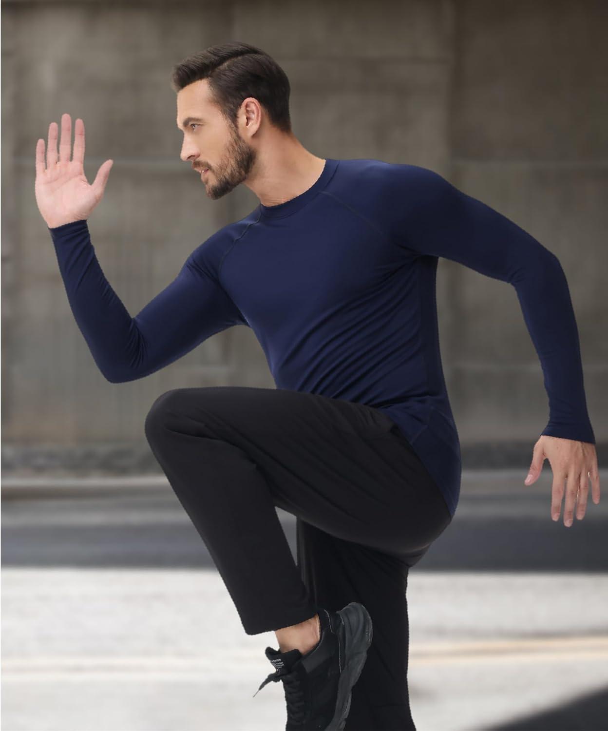 HUGE SPORTS Thermal Underwear for Men Long Sleeve Thermal Shirts Fleece Lined Compression Base Layer Thermal Underwear Top(Navyblue (Crewneck))